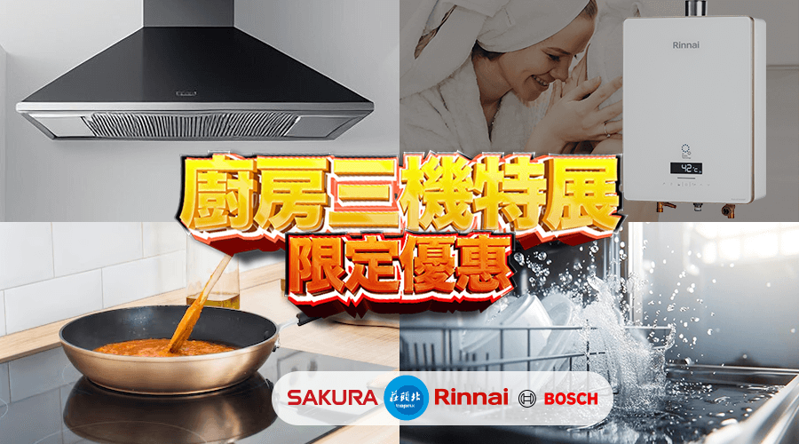 結合最受歡迎三大品牌,櫻花、莊頭北、BOSCH廚具三機,展期限時特惠錯過機會不再!